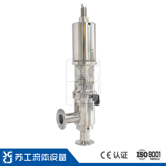 該款安全閥是一款依靠介質壓力自控閥門,另配有手動和氣動開啟功能,可實現CIP在線清洗。通過調整調節蓋壓縮彈簧和鎖緊螺母來校定一個特定壓力,校定壓力是為了避免管道設備損壞而設定的 大安全壓力值,在管道壓力大于安全閥校定壓力時,閥座自動彈起,管道系統中的壓力得到釋放,來達到對管路和設備的保護作用。