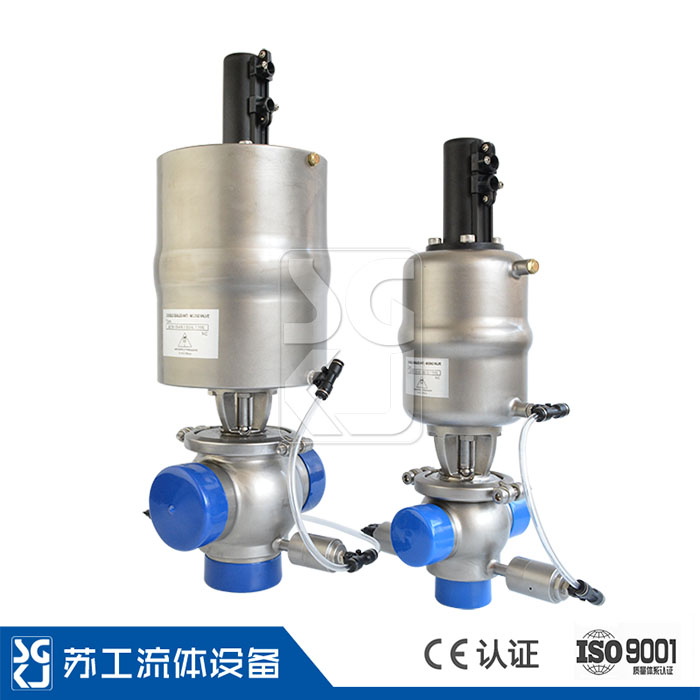 該款設計用來滿足當有兩種不同的產品流經同一只閥門時,保證了產品的混合和檢漏,廣泛應用于食品、釀酒、飲料、乳制品、牙膏化妝品、生物制藥等行業。