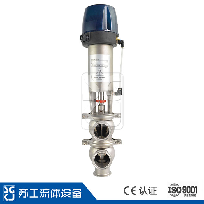接入24V DC電源,線路板,接近開關通電,給入信號打開電磁閥使氣源進入氣缸。利用壓縮空氣推動氣動執行器內的活塞上移,活塞桿和閥桿用定位卡片連接,同時在空氣壓縮推動氣動執行器內的活塞上移時也拉動了閥桿的上移,使閥座上密封面壓緊上閥體密封平面,即關閉上閥口連接。空氣壓縮低于彈簧作用力或無氣體壓縮時,活塞在彈簧的作用下,活塞向下推動同時帶動閥桿下移,關閉下閥口。主要用于管路系統中流體切換,一路進兩路出切換,應用于不存在污染或混料的管路系統中。