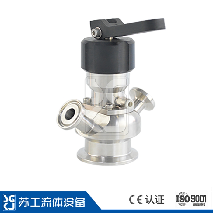 該款無菌取樣閥主要分為氣動組件、手柄、閥體、隔膜密封圈這幾種部件。當處于關閉狀態時,依靠彈簧張力推動閥芯,由閥芯將密封膠頭壓緊在閥體物料進口處,達到密封效果;如果需要取樣時,從其中一個(一般是下方的)取樣口通入蒸汽或其它殺菌介質,將整個樣品室內充滿并從另一個取樣口導出,經過一定時間的作用后使樣品室和取樣口處于無菌狀態;然后通過進給空氣或抬起手柄,收縮彈簧,放松閥芯,使得密封膠頭從閥體物料進口處脫離,從而使樣品從罐內經過樣品室流出,并從取樣口收集;取樣完成后,關閉氣源或放下手柄,放松彈簧,通過閥芯再次將密封膠頭壓緊在閥體物料進口處;通入潔凈水將樣品室內的殘液排出(如果是樣品為無菌水等較干凈的介質時,這一步可以省略),然后注入殺菌介質進行密封留存,待下一次取樣。