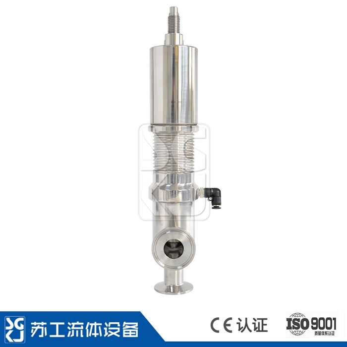 該款安全閥是一款依靠介質壓力自控閥門,另配有手動和氣動開啟功能,可實現CIP在線清洗。通過調整調節蓋壓縮彈簧和鎖緊螺母來校定一個特定壓力,校定壓力是為了避免管道設備損壞而設定的 大安全壓力值,在管道壓力大于安全閥校定壓力時,閥座自動彈起,管道系統中的壓力得到釋放,來達到對管路和設備的保護作用。
