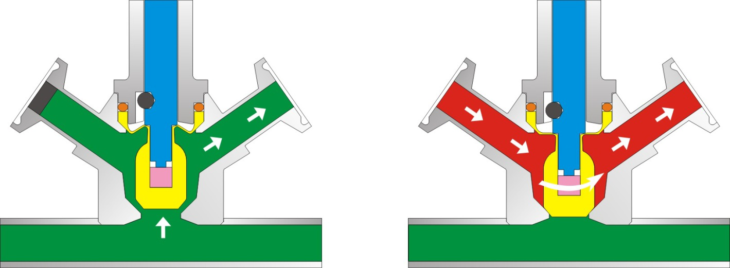 該款無菌取樣閥主要分為手輪、支架、閥芯、閥體、隔膜密封圈這幾種部件。當處于關閉狀態時,依靠順時針旋轉手輪推動閥芯,由閥芯將密封膠頭壓緊在閥體物料進口處,達到密封效果;如果需要取樣時,從其中一個(一般是下方的)取樣口通入蒸汽或其它殺菌介質,將整個樣品室內充滿并從另一個取樣口導出,經過一定時間的作用后使樣品室和取樣口處于無菌狀態;然后通過逆時針旋轉手輪,收拉閥芯,使得密封膠頭從閥體物料進口處脫離,從而使樣品從罐內經過樣品室流出,并從取樣口收集;取樣完成后,順時針旋轉手輪推動閥芯,通過閥芯再次將密封膠頭壓緊在閥體物料進口處;通入潔凈水將樣品室內的殘液排出(如果是樣品為無菌水等較干凈的介質時,這一步可以省略),然后注入殺菌介質進行密封留存,待下一次取樣。